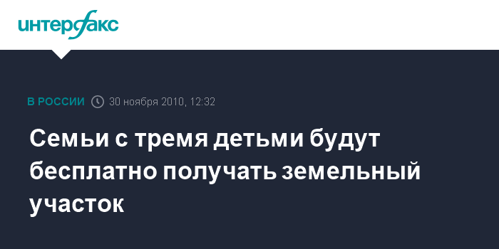 Москва. 30 ноября. INTERFAX.RU - Президент РФ Дмитрий Медведев предложил выделять семьям при рождении третьего ребенка безвозмездный земельный участок под строительство дома.