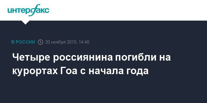 Дели. 30 ноября. INTERFAX.RU - С начала туристического сезона в штате Гоа на юго-западе Индии по неосторожности погибли четверо российских туристов, сообщил генеральный консул России в Мумбаи Алексей Новиков "Интерфаксу" во вторник.