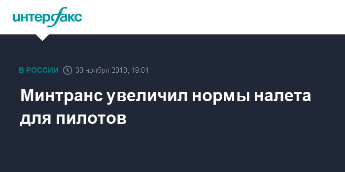 Москва. 30 ноября. INTERFAX.RU – Министерство транспорта РФ увеличило нормы налета для пилотов гражданской авиации. Согласно новому приказу Минтранса, продолжительность полетного времени с письменного согласия члена экипажа и с учетом мнения представителей работника может быть увеличена до 90 часов за один календарный месяц, до 270 часов в квартал, до 900 часов за календарный год.