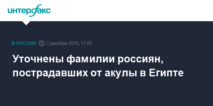 Москва/Женева. 2 декабря. INTERFAX.RU - Уточнены данные и характер ранений российских туристов, пострадавших в результате нападения акулы на египетском курорте Шарм-эш-Шейх, сообщил заведующий консульским отделом посольства РФ в Каире Шамиль Утоев.