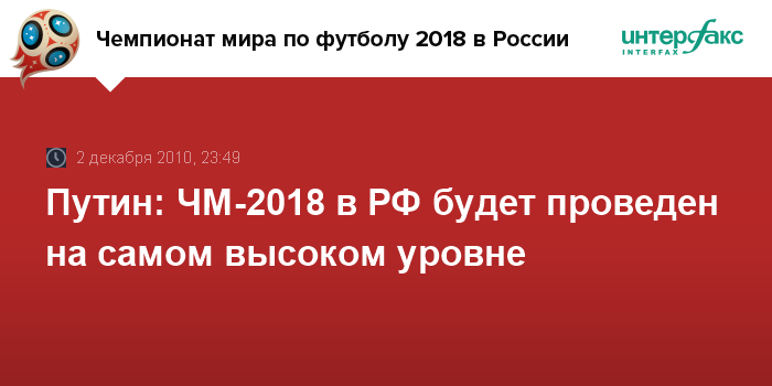Цюрих. 2 декабря. ИНТЕРФАКС - Премьер-министр РФ Владимир Путин обещает, что Россия проведет Чемпионат мира по футболу 2018 года на самом высоком уровне.