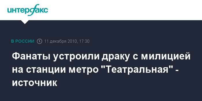 Москва. 11 декабря. INTERFAX.RU - Столкновение между футбольными болельщиками и милицией произошло в субботу вечером на станции метро "Театральная", сообщил "Интерфаксу" источник в правоохранительных органах. "Группа из нескольких десятков футбольных фанатов устроила драку с сотрудниками милиции и дежурными на станции метро "Театральная", которые попытались их остановить", - сказал собеседник агентства.