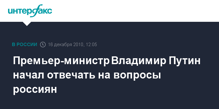 Москва. 16 декабря. INTERFAX.RU - Премьер-министр РФ Владимир Путин начал отвечать на вопросы россиян. Прямую трансляцию ведут телеканалы "Россия", "Россия 24", радиостанции "Маяк", "Вести FM" и "Радио России".