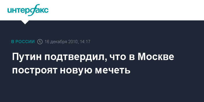 Москва. 16 декабря. INTERFAX.RU - Премьер РФ Владимир Путин заявил, что в Москве будет построена еще одна мечеть.