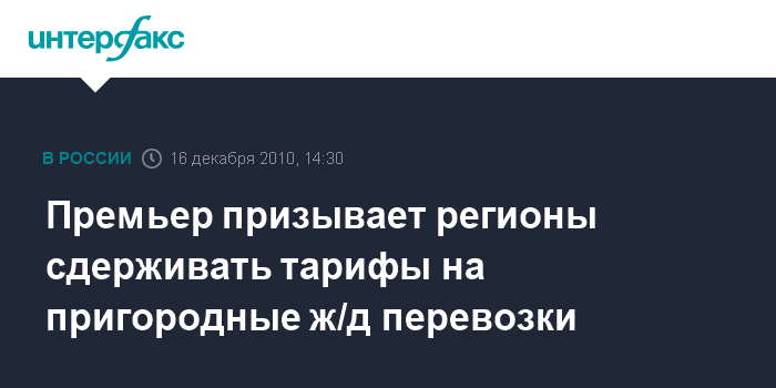 Москва. 16 декабря. INTERFAX.RU - Премьер-министр РФ Владимир Путин призывает сдерживать тарифы на железнодорожные перевозки в пригородном сообщении.