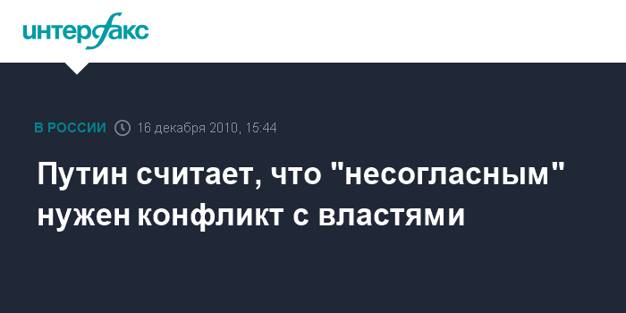 Москва. 16 декабря. INTERFAX.RU - Премьер-министр РФ Владимир Путин считает, что "несогласным" нужны не массовые мероприятия, а конфликт с властями.