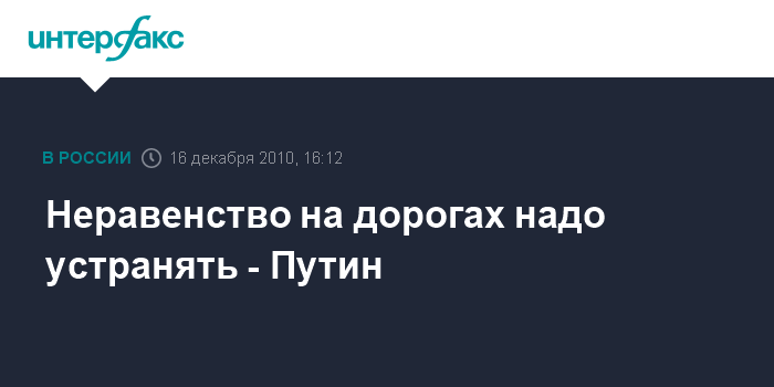 Москва. 16 декабря. INTERFAX.RU - Премьер-министр РФ Владимир Путин призвал устранять неравенство на дорогах, из-за которого простые водители вынуждены простаивать в пробках.
