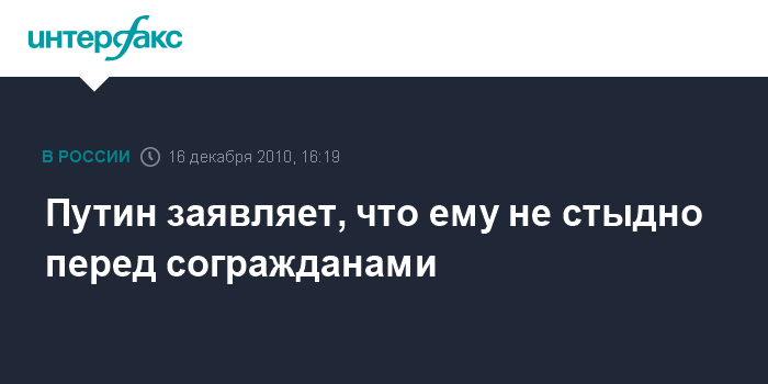 Москва. 16 декабря. INTERFAX.RU - Председатель правительства России Владимир Путин заявил, что ему не стыдно перед согражданами за свою деятельность.