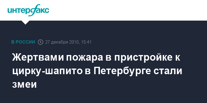 Санкт-Петербург. 27 декабря. INTERFAX.RU - На пожаре в пристройке к стационарному цирку-шапито в Петербурге в понедельник погибли змеи, сообщили "Интерфаксу" в городском управлении МЧС.