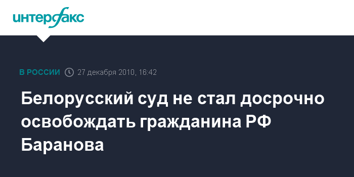Минск. 27 декабря. INTERFAX.RU - Минский городской суд в понедельник отказал в удовлетворении жалобы российского гражданина Александра Баранова на досрочное освобождение, передает корреспондент агентства "Интерфакс".