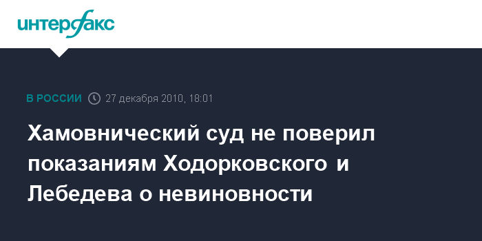 Москва. 27 декабря. INTERFAX.RU - Хамовнический суд не поверил показаниям бывшего совладельца НК "ЮКОС" и экс-главы МФО "Менатеп" о невиновности.