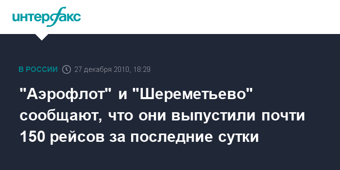 В письме также говорится, что по состоянию на 17.30 мск 27 декабря 2010 года из "Шереметьево" выполнено 143 рейса на вылет и около 110 рейсов на прилет. "Шереметьево" и "Аэрофлот" действуют совместно в рамках общего оперативного штаба, который работает в круглосуточном режиме. Пассажирские терминалы аэропорта функционируют в нормальном режиме. Взлетно-посадочные полосы поддерживаются в полной и постоянной готовности к обслуживанию рейсов. Происходит регулярное информирование пассажиров о статусе рейсов и изменениях в расписании.