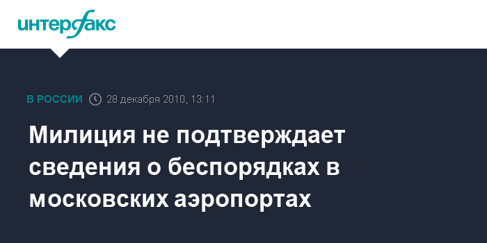 Москва. 28 декабря. INTERFAX.RU - Милиция не располагает подтверждением информации о нарушении общественного порядка в столичных аэропортах "Домодедово" и "Шереметьево".