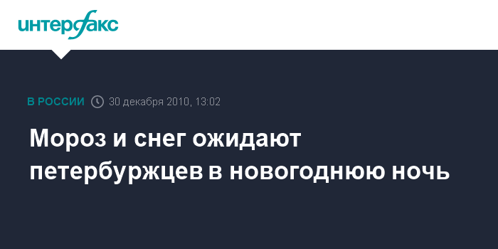 Санкт-Петербург. 30 декабря. INTERFAX.RU - Морозный воздух и небольшой снег прогнозируют синоптики в Петербурге и Ленинградской области 31 декабря и в ночь на 1 января. Как сообщили "Интерфаксу" в городском Гидрометцентре в четверг, в течение пятницы температура воздуха ожидается от 10 до 15 градусов мороза. В первый день нового года усилится ветер до 12 м/с, местами будут метели.