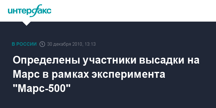 "Да, участники уже определены, но их фамилии я пока назвать не могу. Экипаж перед высадкой на Марс разделится на две группы. Одна группа условно останется на орбите Марса, для того, чтобы поддерживать связь с Землей, а вторая, состоящая из одного российского участника, одного представителя Европейского космического агентства и представителя Китая, спустится на поверхность планеты", - сказал в интервью "Интерфаксу" директор проекта "Марс-500" Борис Моруков.