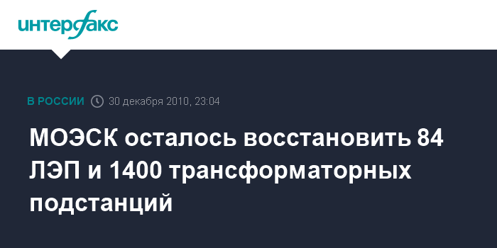 Москва. 30 декабря. ИНТЕРФАКС - ОАО "Московская объединенная электросетевая компания" (МОЭСК) восстановило основные питающие центры Московской области, остается восстановить 44 ЛЭП напряжением 110 кВ и 40 ЛЭП напряжением 35 кВ, сообщили "Интерфаксу" в пресс-службе энергокомпании.