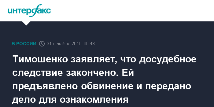 Тимошенко заявляет, что досудебное следствие закончено. Ей предъявлено обвинение и передано дело для ознакомления
