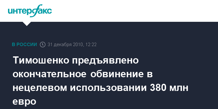 Тимошенко предъявлено окончательное обвинение в нецелевом использовании 380 млн евро