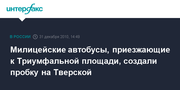Москва. 31 декабря. INTERFAX.RU - На 1-й Тверской-Ямской улице образовалась пробка из-за большого количества автобусов и грузовиков с сотрудниками милиции, которые будут обеспечивать безопасность во время оппозиционной акции на Триумфальной площади в Москве, передает корреспондент "Интерфакса".