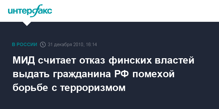 Москва. 31 декабря. INTERFAX.RU - В Москве удивлены тем, что Финляндия отказалась выдать гражданина РФ, обвиняемого в убийстве российских военнослужащих в Чечне.