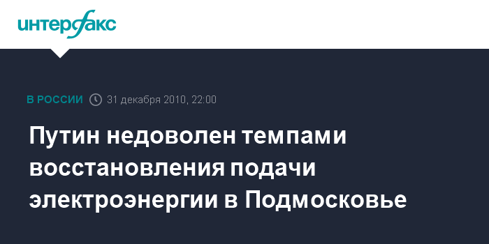 Ново-Огарево. 31 декабря. INTERFAX.RU - Премьер-министр РФ Владимир Путин выразил недовольство темпами восстановления подачи электроэнергии в Подмосковье.