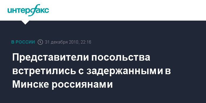 Минск. 31 декабря. ИНТЕРФАКС-ЗАПАД - Дипломаты посольства РФ в Белоруссии вечером в пятницу встретились с двумя задержанными в Минске российскими гражданами, которые содержатся в спецприемнике-распределителе в переулке Окрестина, сообщил агентству "Интерфакс-Запад" советник посольства Вадим Гусев.