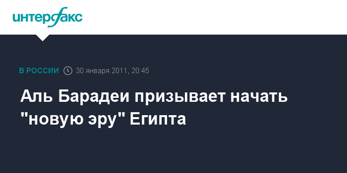 Лондон. 30 января. ИНТЕРФАКС - Египетский диссидент Мохамед Аль Барадеи в обращении к собравшимся в воскресенье вечером на главной площади Каира объявил о необходимости начала новой эры для республики.