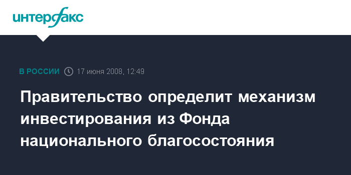 Москва. 17 июня. INTERFAX.RU - Президент РФ Дмитрий Медведев поручил правительству к 1 октября подготовить пакет нормативных документов, определяющих механизм инвестирования средств из Фонда национального благосостояния.