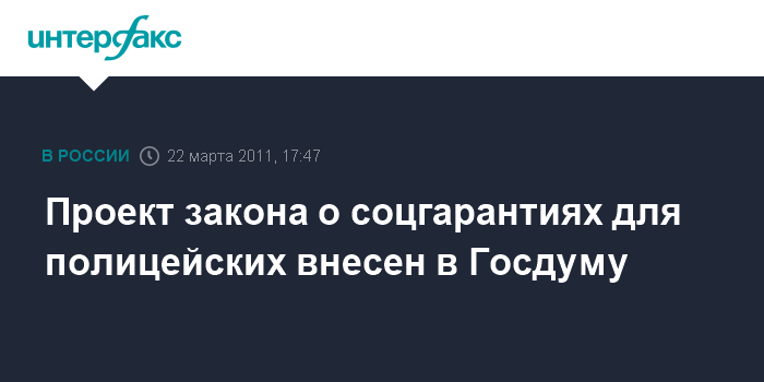 Москва. 22 марта. INTERFAX.RU - Президент России Дмитрий Медведев внес в Государственную Думу проект федерального закона "О социальных гарантиях сотрудникам органов внутренних дел Российской Федерации и внесении изменений в некоторые законодательные акты Российской Федерации", сообщила во вторник пресс-служба главы государства.