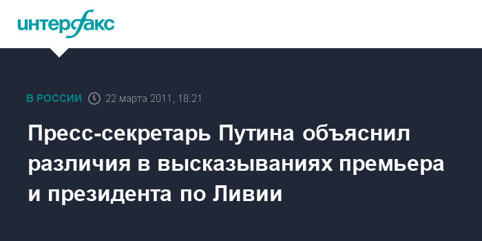 Пресс-секретарь Путина объяснил различия в высказываниях премьера и президента по Ливии