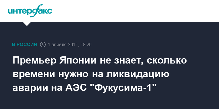 Токио. 1 апреля. INTERFAX.RU - Премьер-министр Японии Наото Кан заявил, что пока неясно, когда специалистам удастся ликвидировать последствия аварии на АЭС "Фукусима-1".