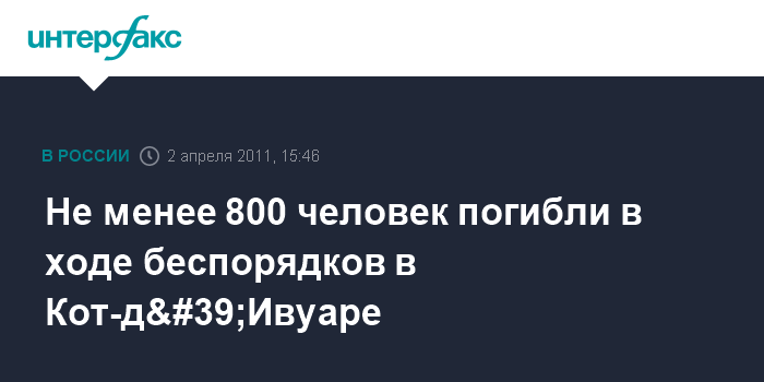 Лондон. 2 апреля. INTERFAX.RU - По меньшей мере 800 человек были убиты 29 марта в результате межобщинных столкновений в городе Дукуэ, на западе Кот-д'Ивуара, сообщает Би-би-си. "У нас есть сведения о том, что не менее 800 человек были убиты 29 марта в Дукуэ в результате межобщинных столкновений. Наши коллеги видели сотни тел погибших", - сказала представитель Красного Креста Доротея Кримицас.