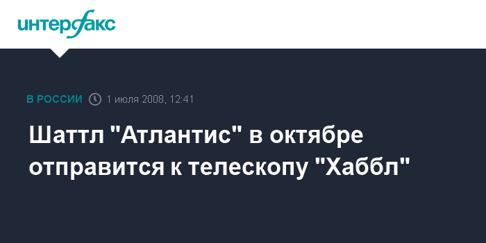 Москва. 1 июля. INTERFAX.RU - Американский шаттл "Атлантис" в октябре совершит последний полет для ремонта и технического обслуживания космического телескопа "Хаббл", сообщает НАСА. "В течение 11-суточного полета экипаж шаттла восстановит и улучшит возможности обсерватории", - говорится в сообщении, опубликованном на сайте НАСА.