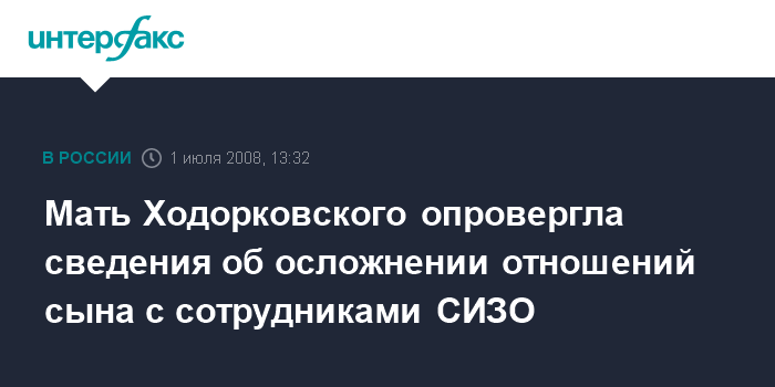 Москва. 1 июля. INTERFAX.RU - Мать находящегося в читинском следственном изоляторе Михаила Ходорковского категорически опровергла информацию о резко испортившихся отношениях экс-главы ЮКОСа с сотрудниками исправительного учреждения и неважном состоянии его здоровья. "Все это полное вранье", - сказала Марина Ходорковская в интервью радиостанции "Эхо Москвы" по поводу публикации в одной из газет на эту тему.