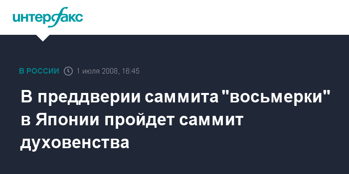 Москва. 1 июля. INTERFAX.RU - Всемирный саммит религиозных лидеров за мир состоится накануне саммита "большой восьмерки" в городе Саппоро на японском острове Хоккайдо 2-3 июля. На форуме соберутся деятели традиционных религиозных организаций из нескольких десятков стран, сообщил корреспонденту портала "Интерфакс- Религия" (www.interfax-religion.ru) один из участников саммита, замглавы Отдела внешних церковных связей Московского патриархата протоиерей Всеволод Чаплин.
