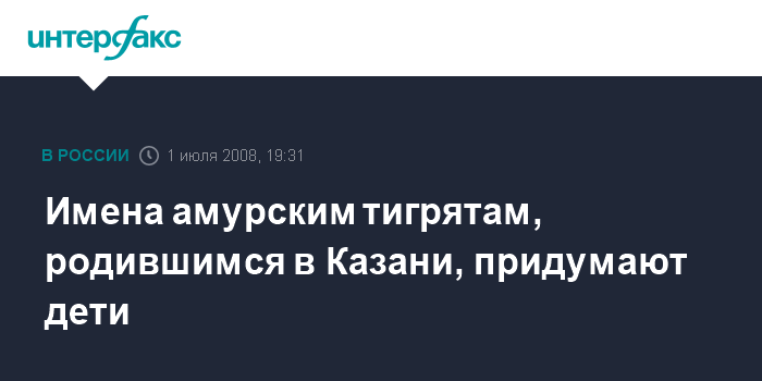 Казань. 1 июля. ИНТЕРФАКС-ПОВОЛЖЬЕ - Казанские дети в ближайшее воскресенье будут выбирать имена двум тигрятам, родившимся месяц назад у пары обитателей казанского зоолого-ботанического сада - амурских тигров Ромашки и Имана.