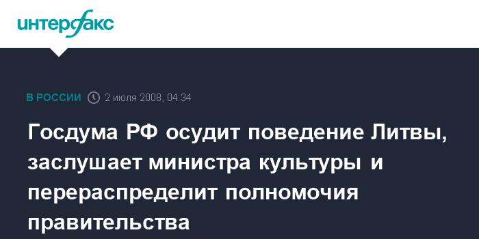 Москва. 2 июля. ИНТЕРФАКС - Госдума в среду собирается принять заявление "О действиях властей Литовской Республики, направленных на ухудшение российско-литовских отношений".