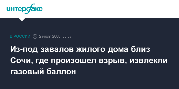 Москва. 2 июля. INTERFAX.RU - Газовый баллон нашли спасатели под завалами жилого дома в пригороде Сочи, где в среду утром произошел взрыв.