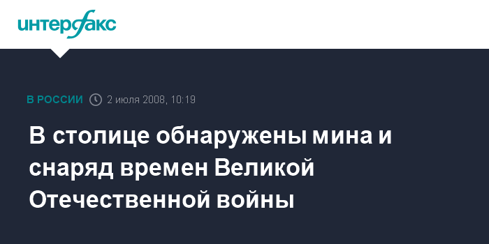 Москва. 2 июля. INTERFAX.RU - В столице обнаружены минометная мина и артиллерийский снаряд времен Великой Отечественной войны, сообщил "Интерфаксу" источник в правоохранительных органах города.