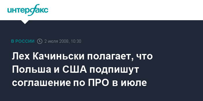 Москва. 2 июля. INTERFAX.RU - США, скорее всего, предоставят Польше приемлемые условия для размещения элементов противоракетной обороны на территории этой страны, и два государства подпишут соответствующие соглашения в июле, заявил президент Польши Лех Качиньски.