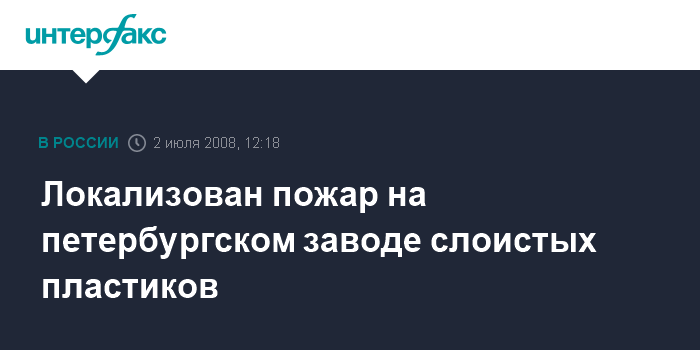 Москва. 2 июля. INTERFAX.RU - В Петербурге локализован пожар на территории завода слоистых пластиков, сообщили "Интерфаксу" в Главном управлении МЧС по городу.