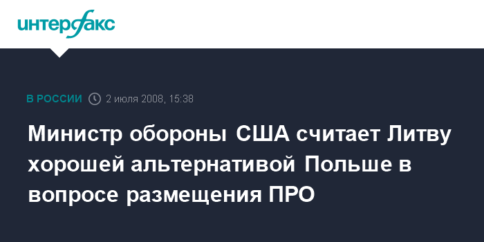 Москва. 2 июля. INTERFAX.RU - Министр обороны США Роберт Гейтс считает Литву "хорошей альтернативой" Польше для размещения американских ракет-перехватчиков ПРО в случае, если Вашингтону не удастся договориться об этом с Варшавой.
