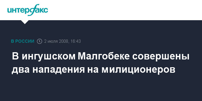 Москва. 2 июля. INTERFAX.RU - В Малгобеке (Ингушетия) неизвестные обстреляли в среду автомашину "Нива" с сотрудниками СОБРа ВОГ (временная оперативная группировка) МВД Ингушетии и патрульную автомашину МВД республики марки "ВАЗ-2107". В результате инцидентов два милиционера погибли, еще двое были ранены, сообщили агентству "Интерфакс-Юг" в МВД Ингушетии.