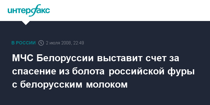 Минск. 2 июля. ИНТЕРФАКС-ЗАПАД - Белорусские спасатели намерены выставить счет фирме-получателю за вытаскивание из болота российской фуры с двадцатью тоннами белорусского молока, сообщил руководитель пресс-службы Гомельского областного управления МЧС Руслан Габрилев.