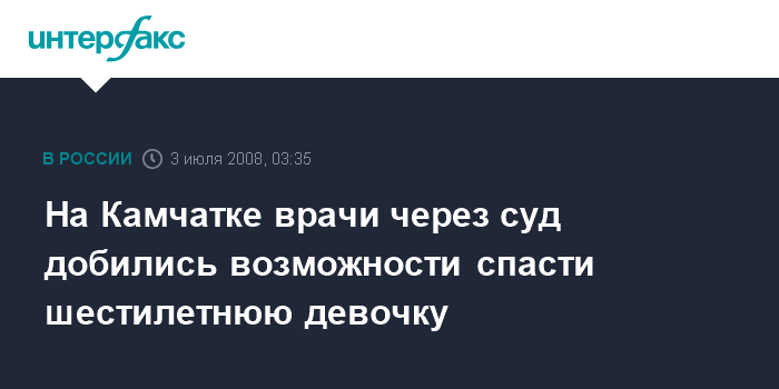 Петропавловск-Камчатский. 3 июля. ИНТЕРФАКС-ДАЛЬНИЙ ВОСТОК - На Камчатке врачам одной из больниц пришлось в суде отстаивать право спасти жизнь шестилетней девочке, против чего выступали ее родители, опираясь на религиозные убеждения.