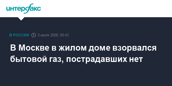 Москва. 3 июля. ИНТЕРФАКС-МОСКВА - В жилом доме на западе Москвы произошел взрыв бытового газа, жертв и пострадавших нет.