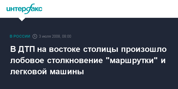 Москва. 3 июля. INTERFAX.RU - Четыре человека пострадали, один из них погиб в результате ДТП в Восточном административном округе. "Около семи часов утра на пересечении Щелковского шоссе и 9-ой Парковой улицы произошло лобовое столкновение маршрутного такси "Газель" и легкового автомобиля", - сообщил "Интерфаксу" источник в правоохранительных органах в четверг.