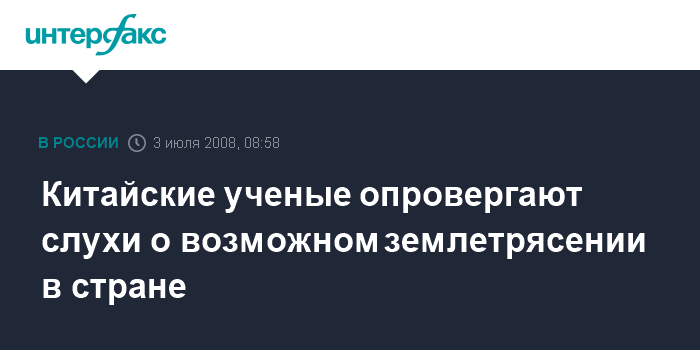 Москва. 3 июля. INTERFAX.RU - Китайские ученые вынуждены были сегодня выступить со статьей в газете "Чэнду ваньбао", в которой опровергаются слухи о том, что 13 сентября 2008 г. в районе самой южной китайской островной провинции Хайнань произойдет землетрясение силой выше 9 баллов, которое вызовет мощную цунами.