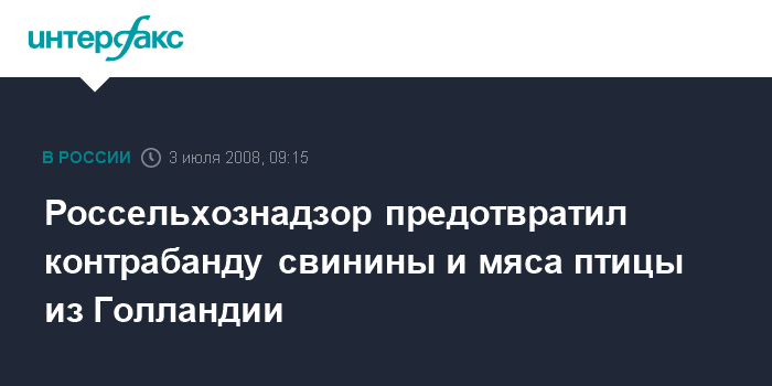 Москва. 3 июля. INTERFAX.RU - Россельхознадзор предотвратил контрабанду свинины и мяса птицы из Голландии. Как сообщает служба, специалисты управления Россельхознадзора по Калининградской области при досмотре ввозимых из Голландии партий свинины и свиной шкурки установили, что предприятие-поставщик не включено в список голландских экспортеров, имеющих право поставок в Россию свинины и свиных мясных продуктов. Груз возвращен поставщику.