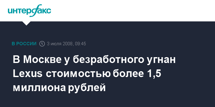Москва. 3 июля. INTERFAX.RU - В Западном округе столицы угнан очередной Lexus стоимостью более 1,5 млн руб, сообщил "Интерфаксу" источник в правоохранительных органах сегодня.
